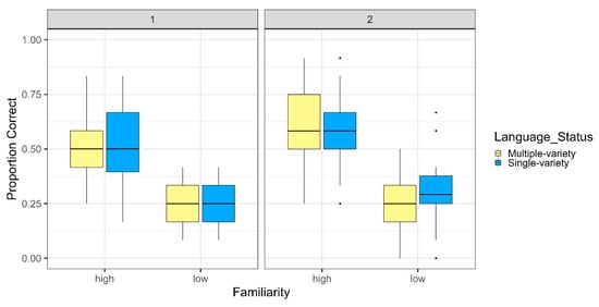 The four additional models differed in which measures predicted performance. The full model outputs are provided in Appendix A. For the multiple-variety exposure group and high-familiarity items, the model revealed significant effects for block (p = 0.049) and recalling sentences (p = 0.029). As expected performance was better on the second block compared to the first, and children with higher scaled scores for recalling sentences performed better on the word recognition task. No other predictors reached significance. All vif values were less than or equal to 4.22, and kappa was 6.08. For the multiple-variety exposure group and low-familiarity items, the model only revealed a significant effect of recalling sentences (p = 0.043) in the expected direction. No other predictors reached significance. All vif values were less than or equal to 4.43, and kappa was 6.07.