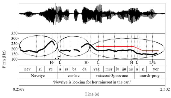 About the utterance in Figure 1, () reports the following: Each ω except for the verb is finally stressed and accentless. There are three φs in this figure, each enclosed in a dotted ellipse. The leftmost and the medial φs are non-final and the rightmost φ is the final φ. Nevriye and arabada ‘in the car’ are parsed as separate, non-final φs. The final φ ends the sentence and is composed of the direct object and the verb. The non-final φs bear a high right edge (H-). The final syllables of the non-final φs (both of which are open syllables) have a similar duration. The final syllable duration of the first non-final φ is 179 ms. The final syllable duration of the second non-final φ is 183 ms. The pitch levelling remains the same in the transition from the second non-final φ to the head of the final φ. The mean F0 of the first non-final φ is 202 Hertz (Hz). The mean F0 of the second non-final φ is 202 Hz, and the mean F0 of the first ω of the final φ is 188 Hz. The final φ begins with a low tone (L). The pitch level remains constant until the end of the first ω within the final φ, which is the head of the final φ and therefore the nucleus of the entire ι (marked with a subscripted n). The head ω of the final φ bears an H on its right edge. The second ω of the final φ (the verb arıyor ‘is looking for’) begins with a low tone (L)—the level of which is scaled relatively lower than the first ω in the final φ (the mean F0 of the nuclear ω is 188 Hz, and the mean F0 of the non-head ω is 153 Hz). The second ω in the final φ constitutes the post-nuclear area of the entire ι. It bears a low-levelled, flat F0, which is typical of post-nuclear ωs in Turkish (), and a low right edge boundary tone, L%.