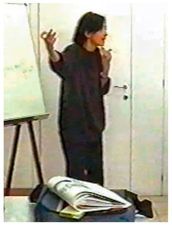 A fifth example refers to a rather gesticulative teacher, who continuously moves back and forth towards the students while explaining a particular use of the subjunctive tense to express a doubt in Italian (“congiuntivo dubitativo”). When she reminds the students that they had worked around the idea of expressing a doubt (“abbiamo lavorato intorno all’idea di esprimere un dubbio”), she opens her arms to create a round circle while using the words “intorno all’idea” (“around the idea”) (Figure 8). In this case, the gesture does not represent a real object, shape or action, but tries to identify an abstract concept in spatial terms by means of the visible metaphor of a circle.