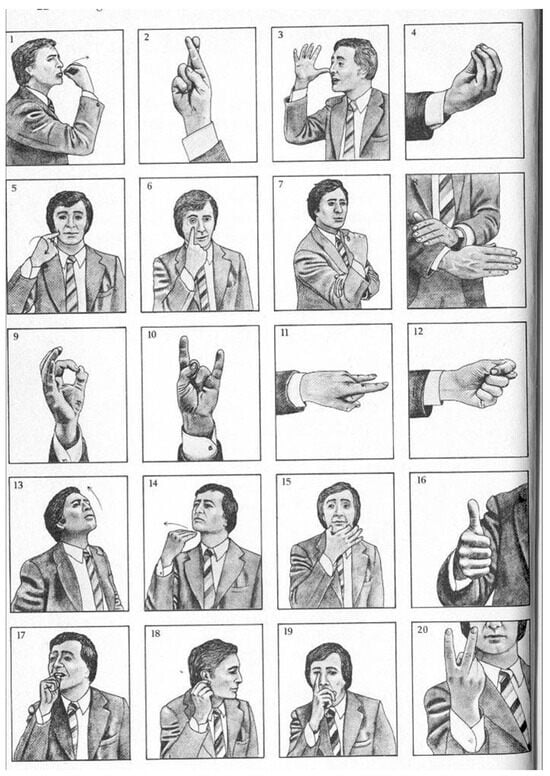 - Morris, Desmond, Peter Collett, Peter Marsh, and Marie O’Shaughnessy. 1979. Gestures. London: Cape. [Google Scholar]