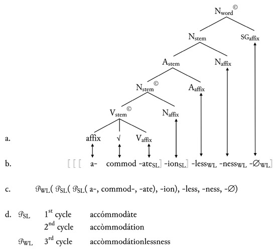 In (a) and (b) in Figure 1, the morphological structure of accòmmodátionlessness is shown. It consists of a root, commod, joined with categorial affixes producing first the verb accómmodàte in a first stem-level cycle and subsequently, in the second stem-level cycle, the noun accòmmodátion (whose input is the output of the first stem-level cycle). Stem-level stress assignment follows the same phonological constraints within that cyclic domain. Once the stem-level stratum has fully applied, its output serves as the input to the word-level phonology, which adjoins additional derivational affixes -less and -ness, as well as the null singular number inflection required of nouns, to the already independent word accòmmodátion, which was the output of the stem stratum, to form accòmmodátionlessness. The opacity of the resulting word-level stress pattern lies both in the placement of the primary stress, four syllables from the rightmost word edge, and that of the secondary stress, which would be expected on the first syllable (Bermúdez-Otero 2018). The stress pattern is instead inherited from and can only be understood by considering the stem-level stratum’s output of accòmmodátion in (d), a necessary intermediate form whose stress pattern remains unchanged by the distinct word-level phonology, and which would be unavailable in a purely parallel phonological account of the word accòmmodátionlessness.