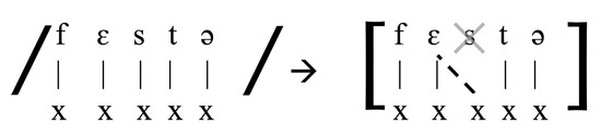 Opposing *X1S2]𝜔 are two constraints of the Max family of Correspondence Theory within OT (McCarthy and Prince 1995), which requires that a phonological entity in the input be realized in the output. Of this family of constraints, the basic Max constraint, ensuring that a segment in the input is present in the output, is violated when coda /s/ deletes. This yields the ranking *X1S2]𝜔 » Max, representing the fact that the phonology prioritizes the avoidance of a sibilant in the coda position over ensuring that all input segments surface in the output. In keeping with the non-moraic approach to OF coda /s/ deletion as motivated in Section 1, I employ Montaño’s (forthcoming) Max(Root) approach to compensatory lengthening upon deletion, rather than a purely moraic approach (Hayes 1989, for example). This constraint requires that the root node of a deleted segment be preserved in the output, by re-associating with an adjacent segment or, if unavailable, by filling the position with an epenthetic segment. An example of the effect of Max(Root) is provided in Figure 2.