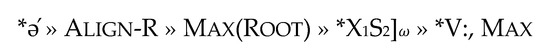 * As stated in Section 2.3, this is a conglomerate constraint used to encapsulate the preference for primary stress on the rightmost syllable of the string within the domain (𝔇) of each stratal cycle (𝔰 = stem or 𝜔 = word). It is not intended to exhaustively formalize all prosodic properties of footing and metrical structure. - *: no schwa bearing primary stress.