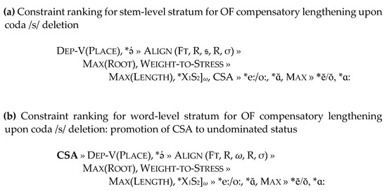 Putting this all together with the dominance relations established already, we arrive at the final constraint ranking in Figure 4 for OF, accounting for the distribution of compensatory vowel lengthening upon coda /s/ deletion, for all lexical types presented in Table 4.