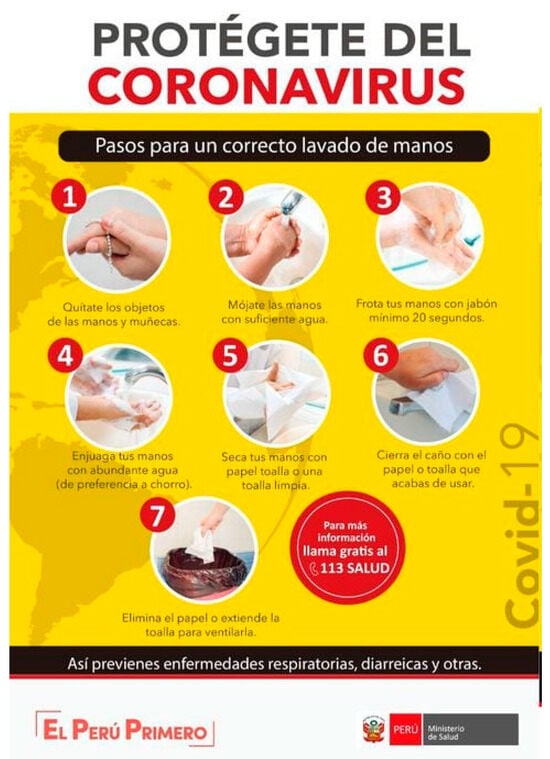 ©Peruvian Ministry of Health. Poster used as a basis for translations into Peruvian Indigenous languages. The title and the main text are in Spanish and literally mean: “Protect yourself against the coronavirus. Steps for a correct hand-wash. That is how you prevent respiratory, diarrheic, and other types of diseases”. All materials can be found and downloaded following this link: https://www.gob.pe/institucion/cultura/campa%C3%B1as/872-acciones-contra-el-coronavirus-lenguas-originarias (last accessed on 18 January 2024).