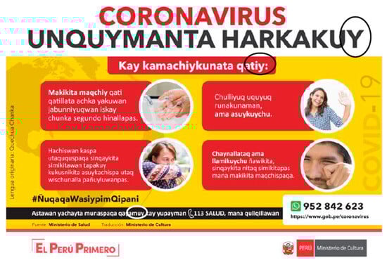 - Ministerio de Cultura traduce información y mensajes preventivos sobre el COVID-19 en 21 lenguas originarias y variantes. 2020. Available online: https://www.gob.pe/institucion/cultura/noticias/112067-ministerio-de-cultura-traduce-informacion-y-mensajes-preventivos-sobre-el-covid-19-en-21-lenguas-originarias-y-variantes (accessed on 8 April 2020).