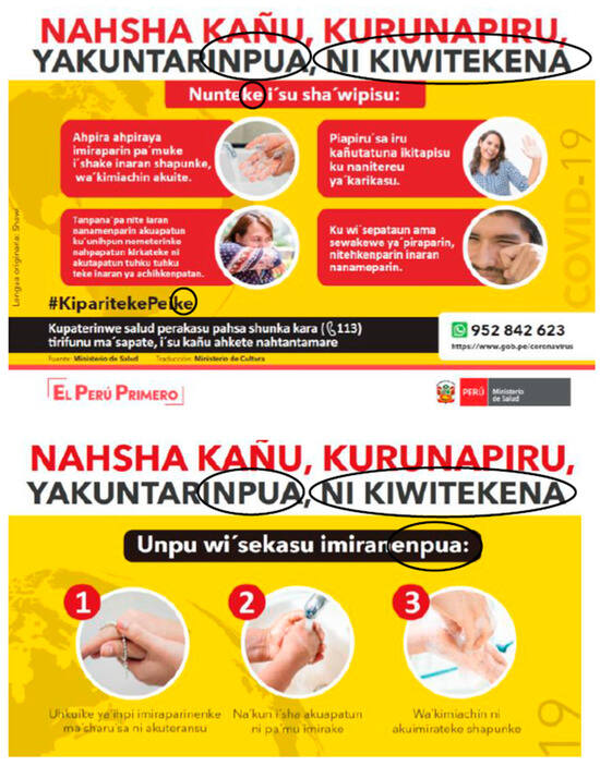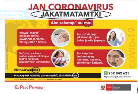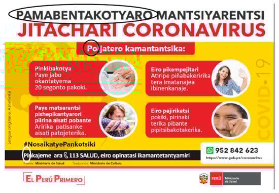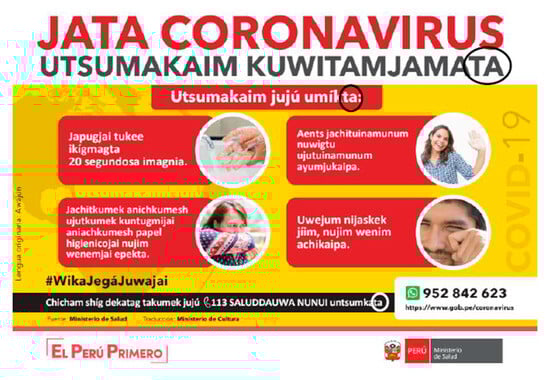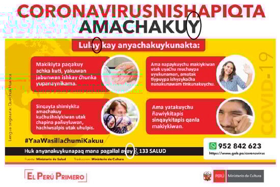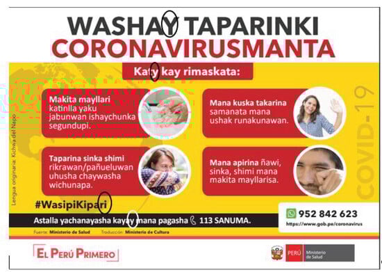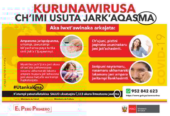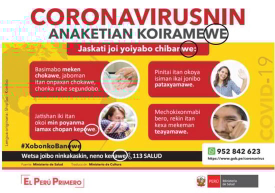 - Acciones Contra el Coronavirus | Lenguas Originarias. 2021. Available online: https://www.gob.pe/institucion/cultura/campa%C3%B1as/872-acciones-contra-el-coronavirus-lenguas-originarias (accessed on 6 August 2021).