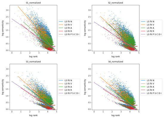 Figure 5 shows the relationship between semanticity and frequency rank for co-occurrences at a distance of 1 when the parts of speech are divided into four classes: nouns, verbs and adjectives, individually, and all function words grouped together, including adverbs. A linear regression (LS) fit was applied to each word class on the logarithmic scale data.