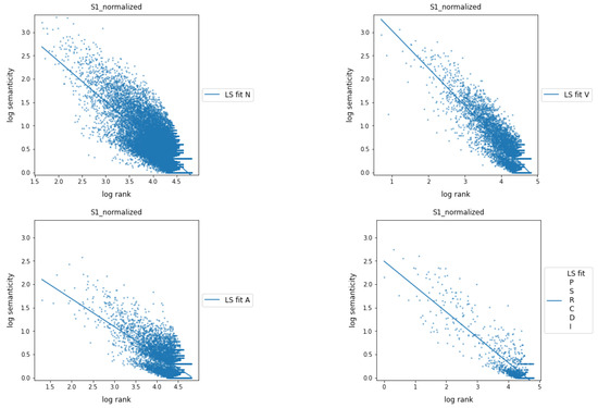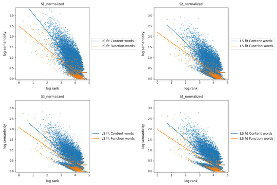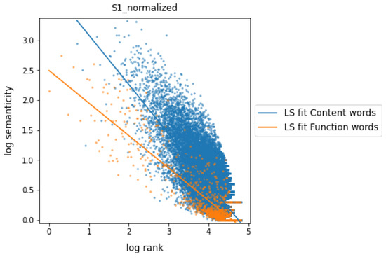 This fact leads us to treat adverbs as a category belonging to the class of function words. So, Figure 3 shows the relationship between semanticity and frequency rank for co-occurrences at a distance of 1 when parts of speech are grouped into the following two classes of words: content words (nouns, proper nouns, verbs, and adjectives) and function words (all other categories, now including adverbs). As a proxy for the general behavior and trend of distributions, a linear regression (LS) fit was applied to both word classes on the logarithmic scale data. Content words, regardless of their rank or frequency of occurrence, exhibit notably higher semanticity values compared to function words. For large ranges, i.e., for low occurrence frequencies, both classes of words show low semanticity values, as expected according to Equation (13). However, when a minimum frequency is required for a word of the corpus to be represented in one of both word classes, semanticity turns out to be a useful measure to characterize and distinguish both classes.