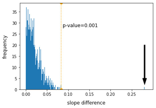In our testing framework, we set up a null hypothesis positing that both classes of words have the same slope, implying they statistically belong to the same population. The chosen statistic to quantify this comparison is the absolute value of the difference in slopes between content and function words. In our specific case, this difference, as indicated in Table 3, is . To assess whether this value is statistically distinguishable from zero, we conducted a permutation test. This involved randomly shuffling the labels of content and function words and computing the absolute difference in slopes for each group. This process aligns with the null hypothesis, assuming similar behavior in log–log plots of semanticity and frequency rank for both word classes. We repeated this procedure 1000 times, generating the histogram shown in Figure 6. All differences obtained under the null hypothesis fell below the dotted orange line, corresponding to a p-value of after 1000 tests, while the difference observed with true labels () is marked with a black arrow. Since the observed differences with true labels exceed this threshold, we statistically reject the null hypothesis, concluding that the differences in slopes are highly significant.