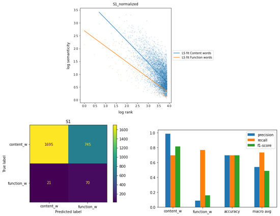 Semanticity vs frequency rank at distance 1 with and normalizations applied with fitting functions. Minimum frequency of a word set at 50 occurrences. The parts of speech are divided into two classes: content words and function words. Confusion matrix derived from predictions on both classes within a test set and evaluation measures associated with the results.