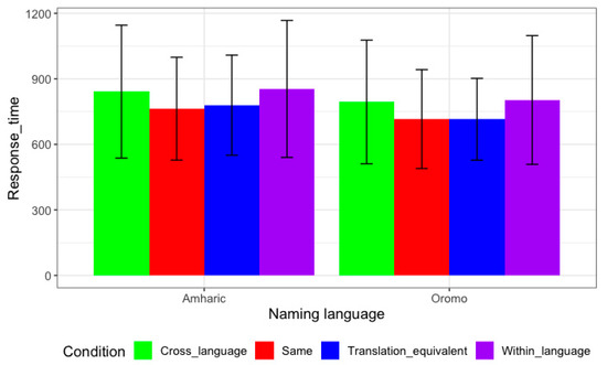 We did not find a significant effect of the languages of picture naming, i.e., the picture-naming latency was almost the same when the pictures were named in Oromo and when they were named in Amharic (B = −25.94, 95% CI [−64.94, 13.06], t(3872) = −1.30, p = 0.192; β = −0.11, 95% CI [−0.27, 0.05]). However, we found a significant effect of the distractor conditions, i.e., compared to the baseline cross-language control condition, the picture-naming latency was shorter in the same condition (B = −63.67, 95% CI [−91.93, −35.40], t(3872) = −4.42, p < 0.001; β = −0.26, 95% CI [−0.38, −0.15]) and it was also shorter in the translation equivalent condition (B = −48.04, 95% CI [−76.54, −19.55], t(3872) = −3.31, p < 0.001; β = −0.20, 95% CI [−0.32, −0.08]). However, there was no significant difference between the two control conditions: within-language and cross-language controls (B = 4.70, 95% CI [−23.71, 33.10], t(3872) = 0.32, p =.746; β = 0.02, 95% CI [−0.10, 0.14]). Moreover, there was a marginally significant interaction between the languages of picture naming and the distractor conditions; for the translation equivalent condition, the response time was slightly shorter when the pictures were named in Oromo than when they were named in Amharic (B = −36.24, 95% CI [−75.69, 3.21], t(3872) = −1.80, p = 0.072; β = −0.15, 95% CI [−0.31, 0.01]). Similarly, the response time was marginally shorter in the same condition when the pictures were named in Oromo than when they were named in Amharic (B = −36.74, 95% CI [−76.20, 2.71], t(3872) = −1.83, p = 0.068; β = −0.15, 95% CI [−0.32, 0.01]). Finally, we found a significant effect of the blocks. Naming the pictures during the second block took a longer time than naming the pictures during the first block (B = 49.74, 95% CI [17.80, 81.68], t(3872) = 3.05, p < 0.001; β = 0.21, 95% CI [0.07,0.34]). Figure 2 shows the error bar and the average response time of each condition.