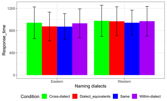 Mean response times (in ms) and error bars across dialects and conditions.