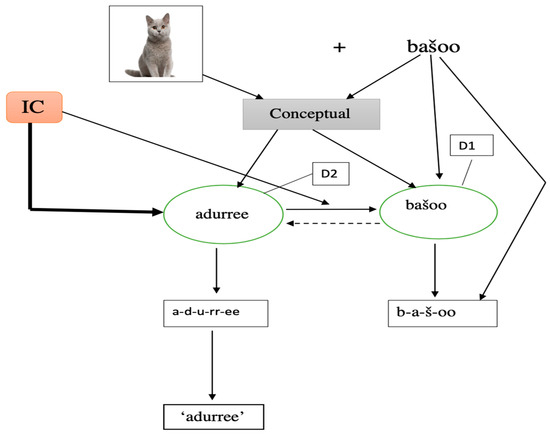 Given the strong link between the lexical representation of bidialectal speakers and the dialect context, we believe that any proposal pertaining to the lexical selection of bidialectal speakers should take the variables of the dialect context into account. In Figure 4, we propose a Dynamic Lexical Selection Model (DLSM), which we adopted from Dylman and Barry (2018). The model assumes that the lexical representation of bidialectal speakers interacts with the context in which the dialects are acquired and used. Like many previous lexical selection models (see Kroll and Stewart 1990, 1994), the Dynamic Lexical Selection Model presupposes that lexical selection involves activations at different levels of lexical selection hierarchy. The conceptual level is at the top of the hierarchy and the phonological level at the bottom, and in-between there is the lexical level. In Figure 4, the levels are interconnected by the down-pointing arrows. At the conceptual level, the visual input, for example, adurree ‘cat’ in the target (Western) dialect and the distractor word bašoo ‘cat’ in the Eastern dialect, initiates the activation of the conceptual representation—for example, the cat has four legs, a mammal, and a domestic animal. Meanwhile, the distractor word concurrently activates the lexical and the phonological representations. Then, the activation is sent from the conceptual level to the lexical level. At the lexical level, three types of activations engage in the lexical selection processes: (1) activation from the conceptual level, (2) inter-lexical facilitation activation (in Figure 4, the solid horizontal arrow shows the stronger D2-to-D1 inter-lexical facilitation) and (3) activation from the inhibitory control (IC). In Figure 4, the activation from the inhibitory control is represented by a thick solid arrow. The activation from the conceptual level facilitates both the target (adurree) and the distractor word (bašoo). Similarly, the inter-lexical facilitation activates both the target and the distractor word. Since both the target and the distractor word receive an equal level of activations from the conceptual level and from the inter-lexical facilitation, the selection of the target (adurree) is ultimately determined by the activation from the inhibitory control. The inhibitory control selects the target dialect via the dialect tag (D1 = Eastern dialect, D2 = Western dialect). In the figure, the thickness of the arrow shows the strength of the activation, i.e., the strongest activation comes from the inhibitory control. The word selected at the lexical level is eventually articulated at the phonological level. It is important to note that the inhibitory control also interacts with the inter-lexical facilitation. We have seen that the (a)symmetry of the inter-lexical facilitation link is the outcome of language dominance. For balanced bilinguals who presumably have enhanced inhibitory control, there is an inter-lexical facilitation link of equal magnitude.