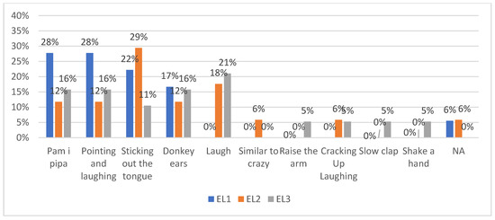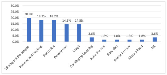 In summary, as can be seen in Figure 2, of the total of 54 realizations, the first gesture available for the set of informants analyzed is that of sticking out the tongue; secondly, pointing to the person being mocked and laughing and, thirdly, the gesture corresponding to “fer pam i pipa”.