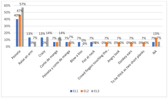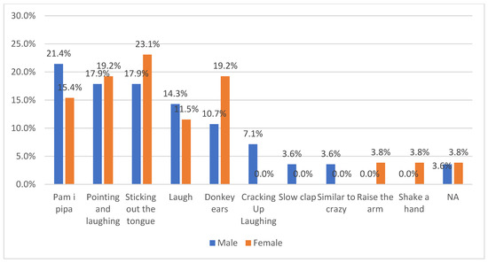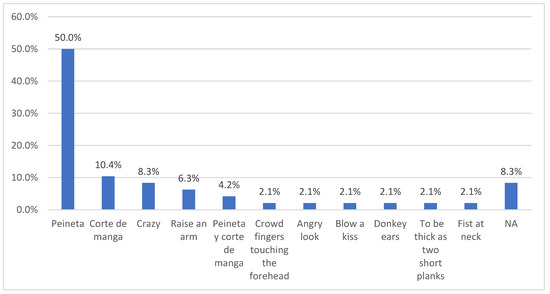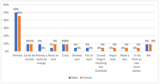 As seen in Figure 3, there are some differences in the use of certain gestures between men and women: men use the ‘pam i pipa’ gesture more frequently, while women tend to employ the act of sticking out the tongue and placing thumbs on their temples while moving their fingers in a waving motion. On the other hand, some gestures like cracking up laughing or slow clapping—used by the sender to mock someone’s achievement—and the ‘loco/a’ gesture have been exclusively reported by some of the male interviewees.