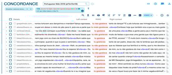 To collect data for the study, we utilized the Brazilian National Domain (.br) of the Portuguese Web 2018 (ptTenTen18) corpus from the Sketch Engine family of corpora (http://www.sketchengine.eu; accessed on 10 April 2023; see Kilgarriff et al. 2014). Sketch Engine was developed by Lexical Computing CZ and functions as a corpus manager, where users can analyze authentic texts of billions of words, known as their text corpora. The Brazilian National Domain corpus alone contains 4.7 billion words from diverse online sources. Due to that diversity, we do not claim that the data analyzed are necessarily representative of either spoken or written BP. However, the data are representative of Brazilian Portuguese as it is found on the web, where both spoken and written texts are available. Moreover, we believe that the constraints we uncover in the analysis to come likely resemble those found in BP more generally, and these constraints can be uncovered more easily by using a diverse online megacorpus. For this study, we opted to use Sketch Engine because it allowed us to look at a broader variety of data from distinct registers, topics, and styles, and also examine the lexical and constructional differences between verbs and different verb forms, facets which previous studies using sociolinguistic interviews have not included in their analysis.