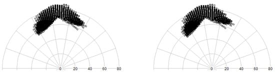 For each token, contours were extracted as series of Cartesian X and Y coordinates, converted to polar coordinates (), and rotated with respect to the occlusal plane using a script. Figure 1 shows sample tracings in the polar coordinate space before and after the rotation, with the origin of the probe indicated as 0.