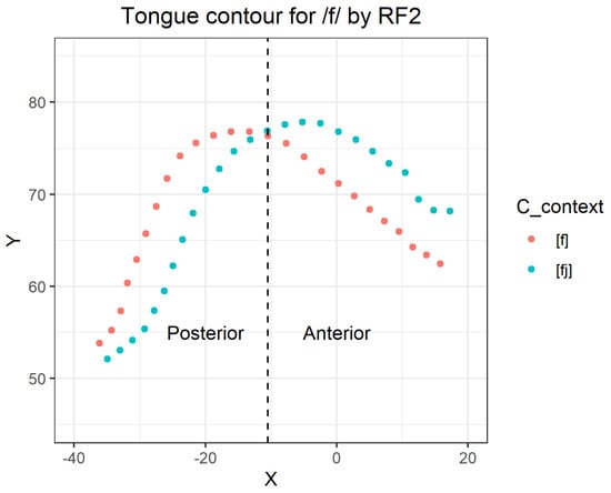 To distinguish between plain and palatalized consonants, we followed () and () in dividing tongue contours into two areas—the anterior and posterior portions, roughly corresponding to the blade/front and the body/root of the tongue, respectively. The boundary between these regions was determined individually for each speaker as the point at which average contours for the plain and palatalized /f/ intersected. As shown in Figure 2 for one of the speakers, the tongue root/back was more posterior and the tongue body/blade was lower for plain [f] than its palatalized counterpart [fj], so that their tongue contours crossed each other around the middle of the tongue. This pattern was consistent for all speakers. Considering speaker RF2 in Figure 2, her tongue contours consisted of 25 points (from point 12 at the front to point 36 at the back of the tongue) shared by all consonants. The speaker’s average plain and palatalized versions of /f/ intersected at point 23, and thus the anterior region for the speaker was chosen to include points 12 to 22, and the posterior region was chosen to include points 24 to 36, as shown in the figure.