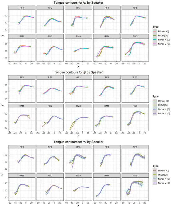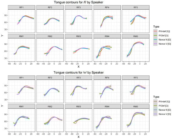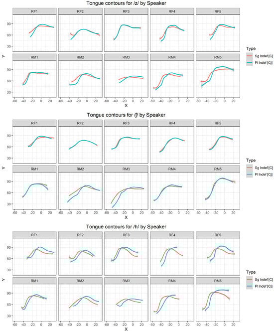 We begin with an overview of differences between plain and palatalized consonants in the first data set (singular and plural indefinite forms). Figure 3 presents gam-generated tongue contours for five consonants in the singular forms (plain) and plural indefinite forms (palatalized), separately by speaker. We can see that palatalized consonants in general (shown in blue) are produced with a raised anterior portion of the tongue and a fronted posterior portion of the tongue, compared to their plain counterparts (shown in red). This holds consistently for the labial /f/ and /v/, and the dorsal /h/. Similar differences, albeit smaller in magnitude, can be observed for /z/, with the exception of speakers RF2 and RF3. The plain-palatalized differences for /ʃ/, in contrast, are most limited: they can be observed visually only for speakers RF1, RM1, RM2, and RM3.