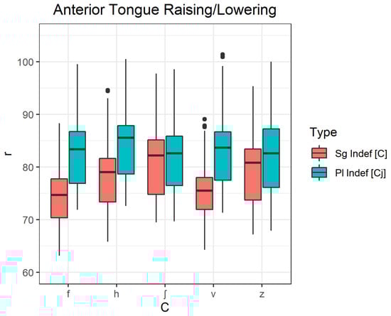 Unlike for Type, significant Consonant differences were limited to a subset of pairs. Specifically, radius distances in the singular forms were higher for plain [ʃ] than for all the other plain variants, [f], [v], [h], and [z] (p < 0.0001; by on average 1.80 to 6.74 mm) and higher for the plain [z] and [h] than for [f] and [v] (p < 0.0001; by 1.31 to 4.93 mm). In other words, the anterior portion of the tongue was raised higher for the plain alveolar [z], dorsal [h] (we remind the reader that in an earlier study () this segment was found to be realized as a velar fricative 86.7% of the time when plain, and palatal fricative 99.7% of the time when palatalized), and especially the postalveolar [ʃ]. In the plural indefinite forms, radius distance was higher for the palatalized [hj] than most other palatalized consonants: [ʃj], [zj], and [vj] (p < 0.0001; by 1.79 to 2.50 mm). That is, the palatalized variant of /h/ (realized as palatal) was produced with a greater anterior tongue raising than for most other palatalized variants of consonants.