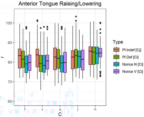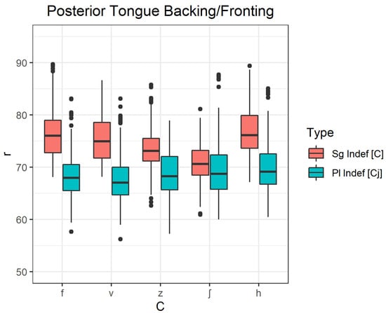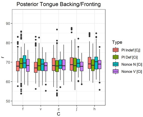 Posthoc tests revealed that radius distance was significantly higher for plural indefinite forms than singular forms, regardless of the consonant (p < 0.0001 for all). This means that palatalized consonants in plural indefinite forms, as a class, were produced with a greater raising of the anterior portion of the tongue. It should be noted (and can be seen in Figure 4) that the magnitude of the radius distance differences between plain and palatalized variants was much greater for the labial /f/ and /v/ (on average 8.5 mm and 8.0 mm), followed by the dorsal /h/ (on average 6.8 mm), and then the coronals /z/ and /ʃ/ (on average 2.8 mm and 1.2 mm). Note in particular the very small (yet significant; χ2(1) = −1.16, p < 0.0001) difference between the plain and palatalized versions of /ʃ/, seemingly indicative of the inter-speaker variation noted above. For a more detailed overview, Appendix C shows the mean radius distance values (r, in mm) for the anterior and posterior portions of the tongue by utterance type and consonant.