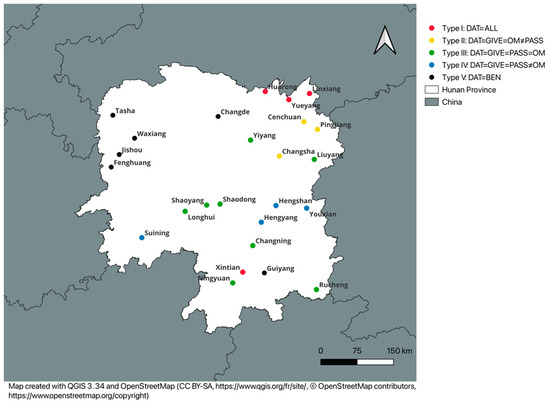 Before embarking on the examination of the dative markers, it is pertinent to offer a brief introduction to the languages spoken in the Hunan Province. Hunan is located in the south-central region of China. According to Bao and Li (1985), the Hunan Sinitic languages can be classified into five broad areas: Xiang varieties spoken in the center of Hunan; Southwestern Mandarin varieties spoken in the west and south; Gan and Hakka varieties spoken in the east; Waxiang spoken in the west; and Tuhua1 spoken in the south (both within the Mandarin-speaking regions). Additionally, there are several non-Sinitic languages spoken in Hunan: Tujia in the northwest; Miao in the west; Dong in the southwest; and Yao in the south. Of these languages, Tujia exhibits SOV word order, while other languages use SVO order. Hunan is classified as a transitional zone for Sinitic languages in Chappell (2015), such that an examination of the Sinitic languages in Hunan can shed light on the refinement of this linguistic area and contribute to a better understanding of the linguistic development within Sinitic languages.