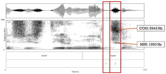Production of insistir mucho ‘insist a lot’ with affricate production as the post-alveolar [tʃ], and a COG of 5943 Hz, with the red boxes showing the occlusion and frication portions of the segment.
