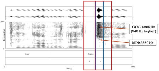 Production of tenga derecho ‘would have the right’ with affricate production as the alveolar [ts], and a COG of 6285 Hz, with the red boxes showing the occlusion and frication portions of the segment (duration), and the blue box showing the analysis of COG (Hz) in the frication portion.