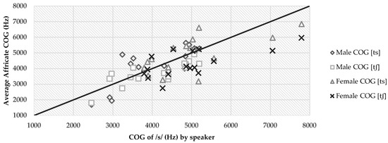 Affricate frication period COG by COG of /s/, subdivided by speaker gender and realization type of [ts] or [tʃ], with reference line to compare affricate productions to /s/ values.