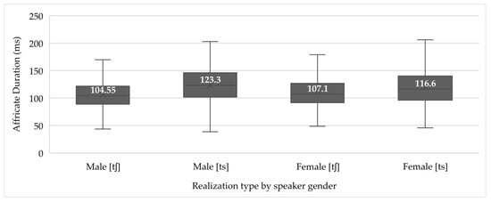 A second measure referenced by Gordon et al. (2002) as a means of classifying productions of sibilant fricatives was segment duration. In their comparison, the authors found that alveolar /s/ tended to be longer than post-alveolar /ʃ/. As the current study focuses on affricates rather than fricatives, there may be a reduction in the magnitude of durational differences, as the two manners of production are not identical. However, as shown in Figure 4, the correlation identified by Gordon et al. is borne out in the current data. While the alveolar affricate had a greater overall variance in duration, average productions of this allophone tended to be longer than post-alveolar tokens, with men producing frication in tokens of [ts] on average 18 ms longer than in [tʃ], and women producing frication 9.5 ms longer.