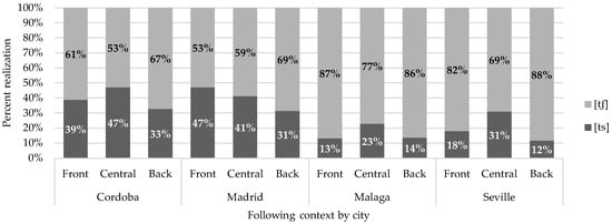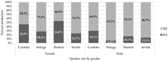 Before developing a logistic regression model, descriptive comparisons of social factors in the data were made to identify general tendencies. The first comparison involved the differences in affricate realization type by speaker city and gender (Figure 5). Overall, the figure shows a reduced rate of alveolar affricate production among men, particularly in Malaga, both overall and in comparison to female speakers. While female politicians in Madrid and Cordoba produce around half of their affricates as alveolar [ts], those in Malaga and Seville produced around a quarter in that way, while men had near or below half as frequent a production of the alveolar variant.