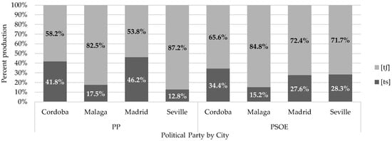 The final comparison involved speakers’ political party and city of origin, allowing a consideration of differences based on political affiliation, as referenced in the discussion of Hernández-Campoy and Cutillas-Espinosa (2013), among others (Figure 6). Unlike many previous features discussed in contexts of political speech, both Figure 5 and Figure 6 suggest a minimal effect of regional variation, with speakers from Madrid and the northern Andalusian city of Cordoba grouping together. To be specific, for political affiliation and gender, conservatives and women from these two cities have a particularly high rate of alveolar production. The variant is infrequent in Malaga across genders and political parties, and relatively infrequent in Seville, as well as among most socialist and male politicians.