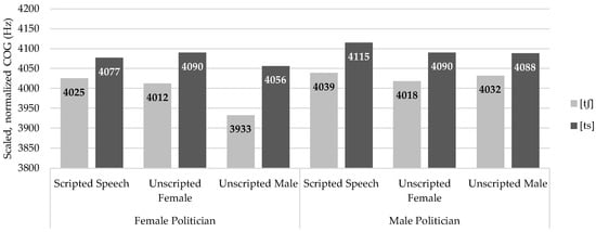 Meanwhile, an examination of the raw COG of /s/ and affricates suggests a trend between types of production of Spanish sibilants, represented in Figure 3. Politicians who produced tokens of /s/ with higher COG frequencies tended to produce both [tʃ] and [ts] with higher COGs as well. For both genders, the normative post-alveolar allophone tends to have a lower COG across most speakers. However, gendered differences also play a role in distinguishing productions, with most female tokens coded as [tʃ] having an average COG frequency similar to that of the male-produced /s/ or [ts]. This underscores the necessity of normalizing COG values to account for these anatomical differences across speakers.