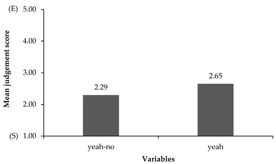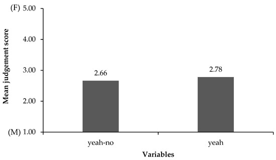 Figure 3 shows the mean judgement scores for the discourse markers yeah-no and yeah. Higher mean judgement scores indicate that participants evaluated the sentences as more likely said by a female speaker. Yeah-no sentences were judged as slightly more likely to be said by a male speaker (2.66) compared to yeah sentences which were closer to no difference between the gender of the speaker (2.78). Both means, however, are close to a neutral score of no difference between genders. This result reflects the findings in Burridge and Florey (2002). That is, there was no overt difference in terms of speaker gender between the discourse markers, despite an effect of gender being found in Moore (2007). A Mann–Whitney U Test reflected the described observation, specifically, that there was no significant difference between the markers, yeah-no and yeah, (U = 1291.5, p > 0.1, η2 = 0.016).