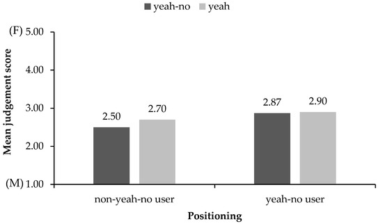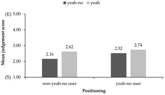 In the self-report section of the online study, the participants were asked to select from one of four available options to respond to a speaker’s question. The options included (1) the discourse marker yeah-no, (2) yeah, (3) no, and (4) no sentence-initial variable. We coded participants who selected yeah-no as a response to the speaker’s questions at least once as yeah-no users and those who did not choose yeah-no as non-yeah-no users. In greater detail, participants selected yeah-no responses infrequently, with variability in the number of selections spanning from none to a maximum of four instances. It is also worth noting that the spread of responses among the middle 50% of participants suggests a consistent trend towards limited usage (IQR = 1). As discussed above in Section 3, traditionally, self-reports run the risk of collecting unnatural reflections of speech, as the speaker can respond with their socially desired response, which may not reflect their actual usage. However, for this study, we were specifically interested in speaker–listeners’ positioning, that is, whether they indicated a preference to use the discourse marker yeah-no in their speech as well as their evaluations of marker’s social meaning. In particular, we sought to investigate whether speaker–listeners’ positioning to the variable mediates their evaluations. For this next analysis, we thus separated yeah-no users from non-yeah-no users to compare their mean judgement scores.