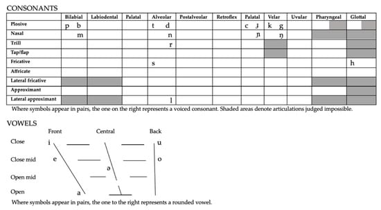 - Soderberg, Craig. D., and Kenneth S. Olson. 2008. Indonesian. Journal of the International Phonetic Association 38: 209–13. [Google Scholar] [CrossRef]