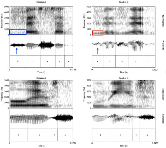 Figure 2 shows the samples of spectrograms taken from two speakers pronouncing the word visit (top) and leaves (bottom). A spectrogram is a sound’s spectro-temporal representation; a spectrogram’s horizontal direction denotes time, while its vertical direction denotes frequency (Odden 2005, p. 10). The spectrographic images in this study were generated using the speech analysis software Praat version 6.1.42. (Boersma and Wennink 2021). It can be seen from Figure 2 that there is variation in the realisation of the phoneme /v/ between the two speakers. While speaker A pronounced the phoneme /v/ as [f], which is voiceless, speaker B maintained the voicing feature of the phoneme. Based on the spectrographic image, a clear voicing bar can be observed in the first formant of the speech of speaker B (indicated in red), whereas the speech of speaker A does not seem to have a voicing bar in the F1 where phoneme /v/ is located (indicated in blue). Moreover, the harmonic-like pattern in waveforms (indicated by the arrows) clearly indicates that the /v/ sound in Speaker B’s data is voiced, while the friction noise pattern in the waveform of Speaker A suggests that the sound is voiceless. This variation does not reflect the variation in different speakers’ groups from different regions, as some speakers often pronounce phoneme /v/ as [v] or [f] inconsistently.
