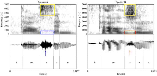 Sample of a spectrographic and waveform image of the realisation of /z/ in the word ‘thousand’; speaker A (left); speaker B (right).