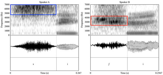 Sample of a spectrographic and waveform image of the realisation of /ʃ/ in the word ‘she’; speaker A (left); speaker B (right).