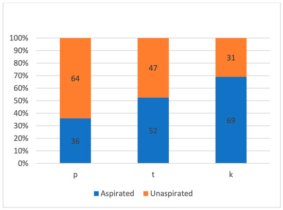 In addition to consonants, the aspiration of voiceless plosives in the word-initial position is also important in LFC (Jenkins 2000). This is important because unaspirated voiceless plosives are often confused with voiced plosives in this position. Figure 5 shows the percentage of the realisation of /p, t, k/ in Indonesian-Accented English speech data. There were two common realisations of the three plosives in the word-initial position in the data (i.e., aspirated and unaspirated).
