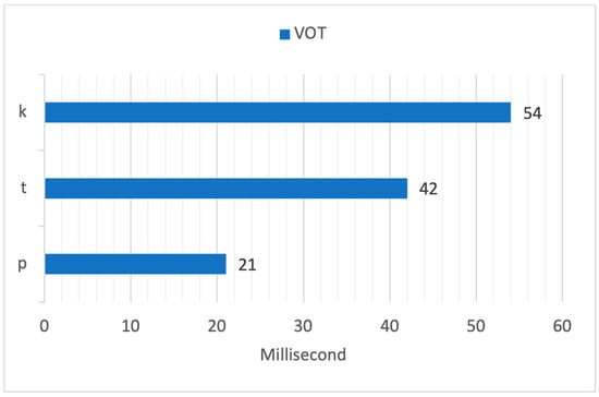 Concerning the aspiration of plosives in the beginning of a word, the VOT for /p/ was notably shorter at 21 ms compared to /t/ or /k/, which had VOTs of 42 ms and 54 ms, respectively. Lisker and Abramson (1964) propose that VOT values ranging from 0 to 25 ms indicate unaspirated plosives, suggesting that plosive [p] in the data appear to be unaspirated, as the VOT is below 25 ms. In addition, compared to that of English native speakers, VOTs of voiceless plosives produced by Indonesian speakers are relatively shorter. The mean VOTs of /p, t, k/ in Lisker and Abramson’s (1964) study are 58, 70, and 80 ms, respectively, whereas the mean VOTs of /p, t, k/ produced by the Indonesian speakers in the study are 21, 42, and 54 ms, respectively. The tendency of Indonesian speakers to use unaspirated plosives in the word-initial position in their English could be associated not only with L1 transfer but also markedness. Markedness refers to the inherent tendencies or preferences across languages for specific forms or features such as voiceless over voiced sounds (Hansen Edwards and Zampini 2008). Indonesian phonology does not have allophonic variation in plosives in the word-initial position. In addition, it is generally assumed that aspirated voiceless plosives are more marked than the plain voiceless plosives (Jakobson and Halle 2002; Rice 2007). These unaspirated plosives are a regular feature of Indonesian-Accented English.