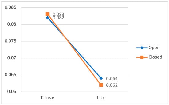 A graphical representation of the mean duration of vowels concerning syllable type and tenseness factors is displayed in Figure 7. It can be seen that tense vowels were associated with numerically longer vowel duration (Mopen = 0.082 and Mclosed = 0.083) compared to lax vowels in either open or closed syllables (Mopen = 0.064 and Mclosed = 0.062).