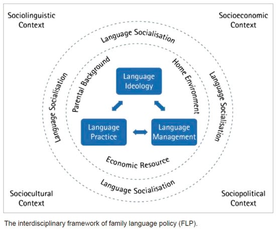 Based on this, it has been suggested that the FLP model as developed by () has to be considered in a broader context of sociolinguistic, socioeconomic, sociocultural, and sociopolitical factors. More immediate factors such as the parents’ background, home environment, socioeconomic status, and patterns of language socialization contribute to the formulation and shaping of FLP. These ideas were introduced by () and have been widely discussed since then (see Figure 1).