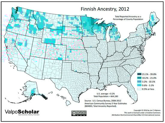 - Kilpinen, Jon T. 2014. Finnish Ancestry, 2012. United States Map Gallery, Map 07.07. Available online: http://scholar.valpo.edu/usmaps/66 (accessed on 6 April 2024).