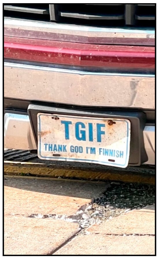 The statement in Excerpt 1 reflects a nationalistic ideology that underscores loyalty to their Finnish heritage and the simultaneous pride they take in it. The speaker also acknowledged their diverse ancestral background, yet Finnish was what they most engaged with and were enthusiastic about. Excerpt 2 highlights another manifestation of pride and loyalty within the Finnish American community. The anecdote exemplifies a humorous expression of pride. The remark, “you know what I’d be if I wasn’t Finnish…ashamed!” accompanied by laughter, illustrates a comical yet sincere embrace of Finnish identity. This attitude is reverberated by material culture such as the TGIF, THANK GOD I’M FINNISH license plate in Hancock (see Section 2.3). This anecdote reflects the strong sense of loyalty and camaraderie among Finnish Americans, as well as their pride in their cultural heritage, coming together to form a nationalistic ideology.