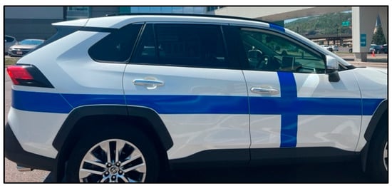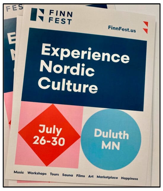 Moreover, FinnFest USA5, the largest festival celebrating Finnish and Finnish American culture and heritage in North America, has chosen Duluth as its home base for five consecutive years. Marianne Wargelin, President of FinnFest USA, attributed this decision to Duluth’s superior infrastructure compared to smaller, historically Finnish American towns that lacked adequate logistical support and public transportation accessibility (26 March 2024). The decision to choose a location with Nordic ancestry for events such as FinnFest USA underscores a strategic approach and signifies an openness to expand beyond solely Finnish interests exemplified by the “Experience Nordic Culture” (see Figure 4) statement on the advertising poster of FinnFest. The researcher’s presence during the 2023 FinnFest in Duluth may have influenced the expressions of Finnishness observed, leading to a greater abundance of public displays compared to what may be seen on an average day. Nonetheless, Figure 5 displays a car belonging to a resident of Duluth adorned with a blue cross reminiscent of the Finnish flag, a permanent fixture that extends beyond the scope of FinnFest and performativity as a result of the festival.