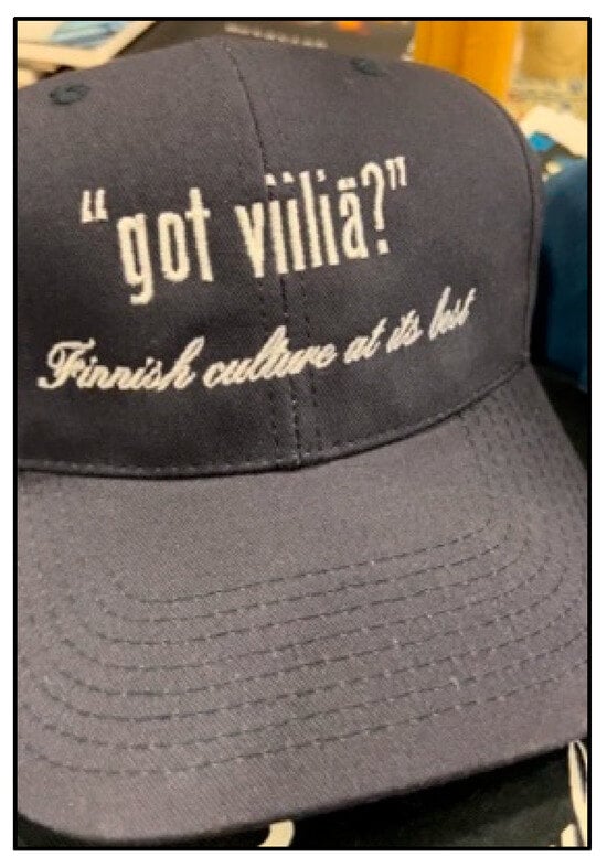The majority of public manifestations of Finnishness in Duluth were associated with FinnFest due to my time there during the festival. One of the many manifestations found included a hat (see Figure 8) referencing the practice of making viiliä, fermented or cultured milk, a practice that remains common among Finnish Americans in Northern Minnesota. In fact, the hat was made with a clever double meaning playing off the English translation, “cultured milk”. The hat’s designer, Steve Leppälä, skillfully utilized this linguistic subtlety, and thus the hat features the phrase Finnish culture at its best. This interpretation features indexical meaning () because it is understood by Finnish Americans, and, more specifically, those in Duluth. These findings also relate to what (), who studied Finnish Americans in Seattle, describes when Finnish Americans have objects that allow them to express their identities as Finnish Americans and not solely as Americans. Karjalainen explains that these manifestations connect to authenticity () in relation to discourse on identity and belonging.