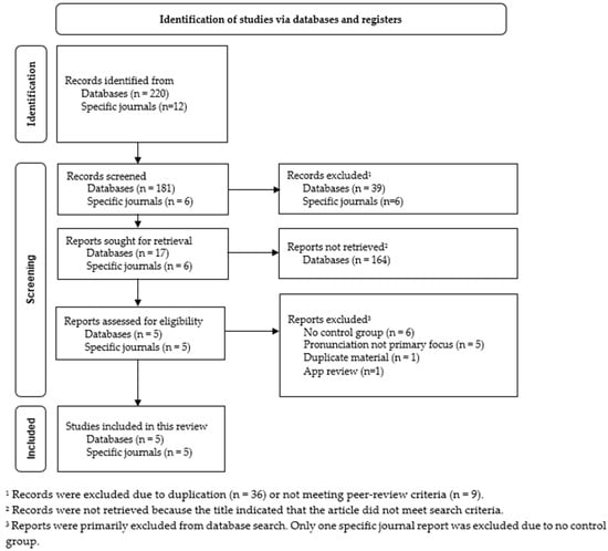 - Metruk, Rastislav. 2024. Mobile-assisted language learning and pronunciation instruction: A systematic literature review. Education and Information Technologies. [Google Scholar] [CrossRef]