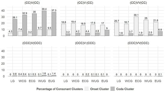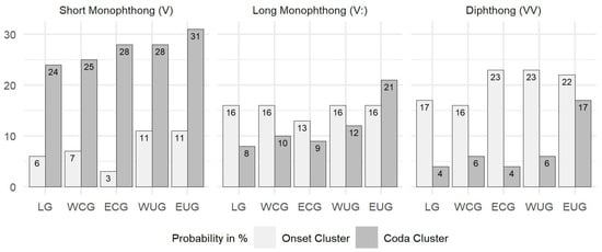 Percentage of onset (lighter gray) and coda (darker gray) CC or CCC consonant clusters for different vowel types (V, Vː, VV) in the dialects of Low German (LG), West Central German (WCG), East Central German (ECG), West Upper German (WUG) and East Upper German (EUG).